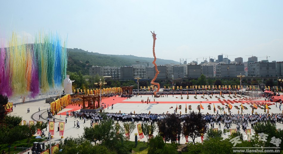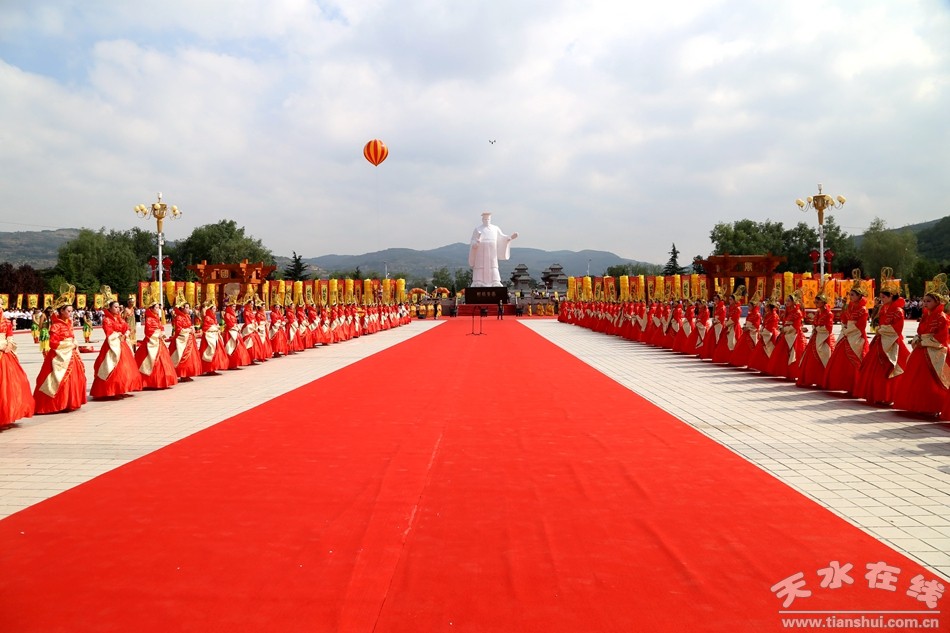 在樂舞告祭過程,來自軒轅小學(xué)的200多名學(xué)生深情演唱了歌曲《黃帝頌》;由88名女青年身著漢、唐服飾翩然起舞,分禮、祭、拜、頌四部分對(duì)軒轅黃帝進(jìn)行樂舞祭祀;此外,還表演了陣容龐大、氣勢(shì)恢宏的清水軒轅鼓舞,表達(dá)了人們對(duì)軒轅大帝的無限敬仰之情。祭祀典禮在《巨龍騰飛》中結(jié)束——一條氣球做成的巨大飛龍騰空而起,飛向高空——這寓意著清水騰飛,甘肅騰飛,中華騰飛。