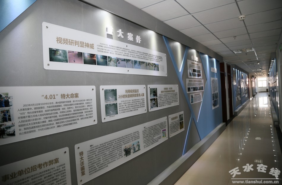 清水縣公安局警營(yíng)文化長(zhǎng)廊的設(shè)計(jì)形式簡(jiǎn)潔大氣、內(nèi)容設(shè)計(jì)具體、版面立意準(zhǔn)確、圖片傳神、文字凝練深刻。全長(zhǎng)370多米約1000平方米的警營(yíng)文化長(zhǎng)廊,由浮雕、木雕、卷軸、畫像、圖片、文字、書畫作品等不同元素組成,在不同的樓層,以不同的主題,分別展現(xiàn)了公安工作的發(fā)展演變史,全景式展現(xiàn)了清水公安各個(gè)歷史階段,各個(gè)職能部門的發(fā)展變化。同時(shí)以從嚴(yán)治警、從優(yōu)待警、文化育警為主題,通過歷史文化和警令紀(jì)律的結(jié)合,為執(zhí)法行為畫上紅線;以黨建、警史、榮譽(yù)為主題,通過規(guī)范規(guī)章制度、選樹先進(jìn)典型,為今后的發(fā)展明確思路和目標(biāo)。