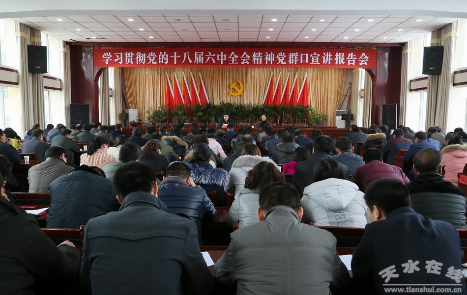 根據(jù)縣委統(tǒng)一部署,1月11日下午,市人大常委會副主任、清水縣委書記劉天波為黨群口各單位干部職工宣講十八屆六中全會精神。縣委常委、宣傳部長盧芳主持會議;副縣長、縣委辦公室主任王懷珍及黨群口全體黨員干部共150余人聆聽了宣講報告。