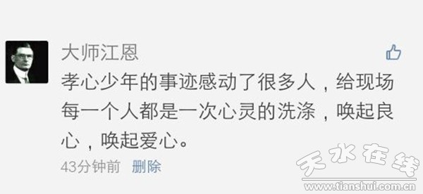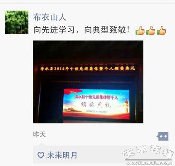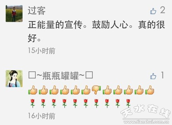 在這些表彰人物中,他們雖然來自不同的行業(yè)和領(lǐng)域,但他們的事跡質(zhì)樸真切、感人至深。他們中有遭遇變故獨(dú)自撐起家庭重任的王保紅、有小小年紀(jì)就擔(dān)負(fù)起照顧媽媽和爺爺奶奶重任的馬巧瑞、有雖然雙目失明卻依然創(chuàng)業(yè)成功的盲人青年高彥平、有為了患者不顧自己安危的好醫(yī)生王柏權(quán)、有為了城市干凈而數(shù)十年如一日?qǐng)?jiān)守崗位的環(huán)衛(wèi)工馬玉蘭,這些平凡人物的故事,蘊(yùn)藏著向上向善的果敢和追求,每一次“最美”選擇,都超越了一己得失的考量,成為照亮道德之路的前行力量,感人的事跡讓在場(chǎng)的觀眾備受鼓舞。當(dāng)這些事跡被報(bào)道后,大量網(wǎng)友紛紛通過“美麗清水”微信公眾平臺(tái)、新浪微博、市長(zhǎng)留言板、微信(QQ)朋友圈等平臺(tái)進(jìn)行點(diǎn)贊評(píng)論。
