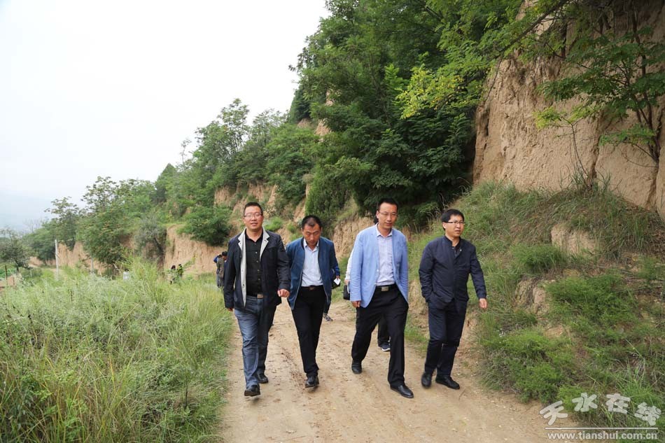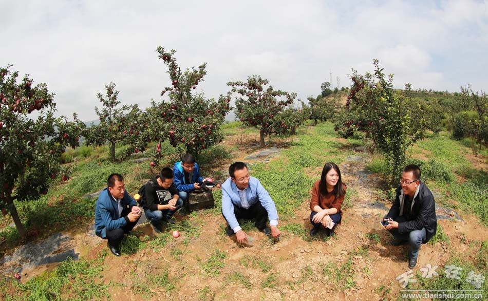 。ㄇ逅h商務(wù)局局長張偉,郭川鎮(zhèn)黨委書記李赟、鎮(zhèn)長王小軍和天水在線一行走進(jìn)宋川村蘋果園,查看蘋果長勢,商定“宋川村果農(nóng)微信直銷自家花牛蘋果”事宜。)