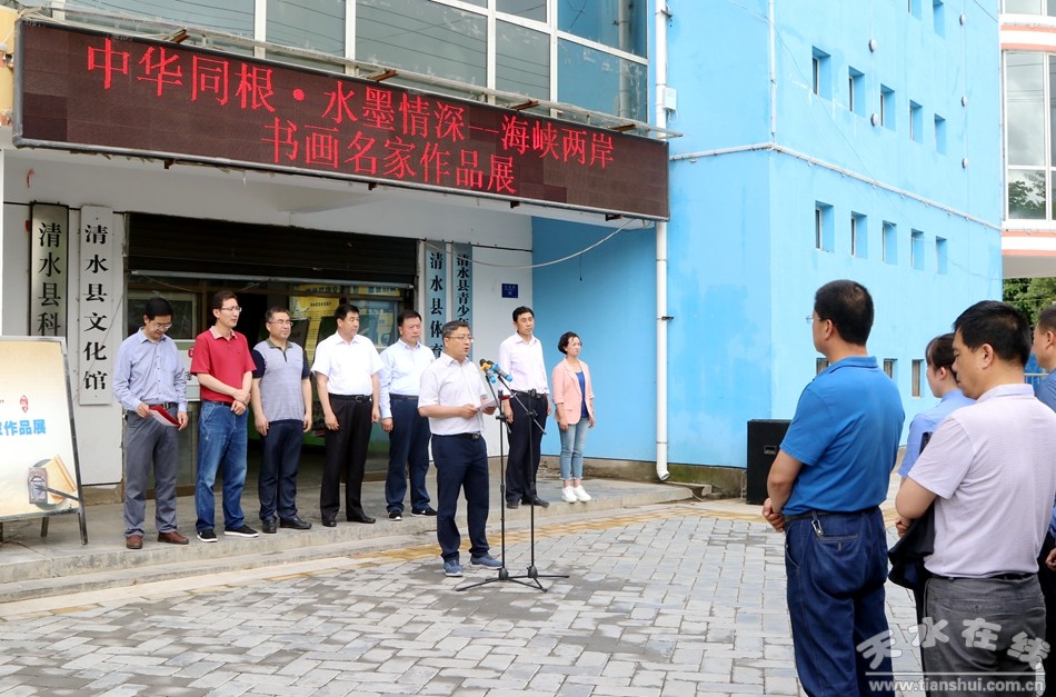 6月25日下午,“中華同根﹒水墨情緣”海峽兩岸書畫名家展在清水縣文化館開展。市人大常委會副主任、清水縣委書記劉天波宣布書畫展開展;縣領導仇金虎、馬利民、周濟、程伯義、劉志偉、張軍、溫智玲出席開展儀式。