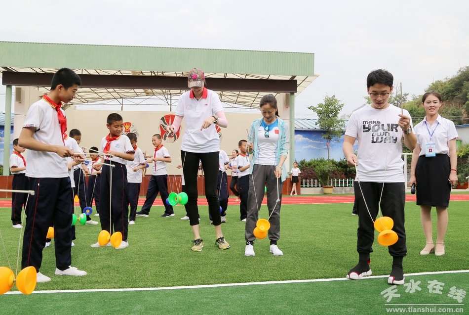 走進原泉小學,孩子們正在開展大課間活動,做著各類文體活動和游戲。近年來,該校積極開展運動跑步、七彩陽光廣播體操、乒乓球創(chuàng)意操、課間游戲、傳統(tǒng)體育運動等內(nèi)容,使體育項目、藝術(shù)、游戲融合成“三位一體”的綜合體育大課間活動,形成熱愛體育、崇尚運動、健康向上的良好風氣。在空竹、滾鐵環(huán)、足球互動游戲等表演場地上,三位奧運冠軍應(yīng)邀與孩子們互動,了解大課間活動開展情況,他們拿起空竹、鐵環(huán)、足球與孩子們一起表演,時時向孩子們詢問操作要領(lǐng),學生們十分高興,爭相與奧運冠軍們切磋技術(shù),大家紛紛拉住冠軍簽名、留影,現(xiàn)場氣氛活躍。同時,三名奧運冠軍向原泉小學部分貧困學生贈送體育用品及小熊,原泉小學向三位冠軍贈送清水剪紙,三位奧運冠軍向師生們傳遞了奉獻、拼搏和擔當?shù)木,鼓勵小學生堅持理想信念,勇于追求夢想、挑戰(zhàn)人生。