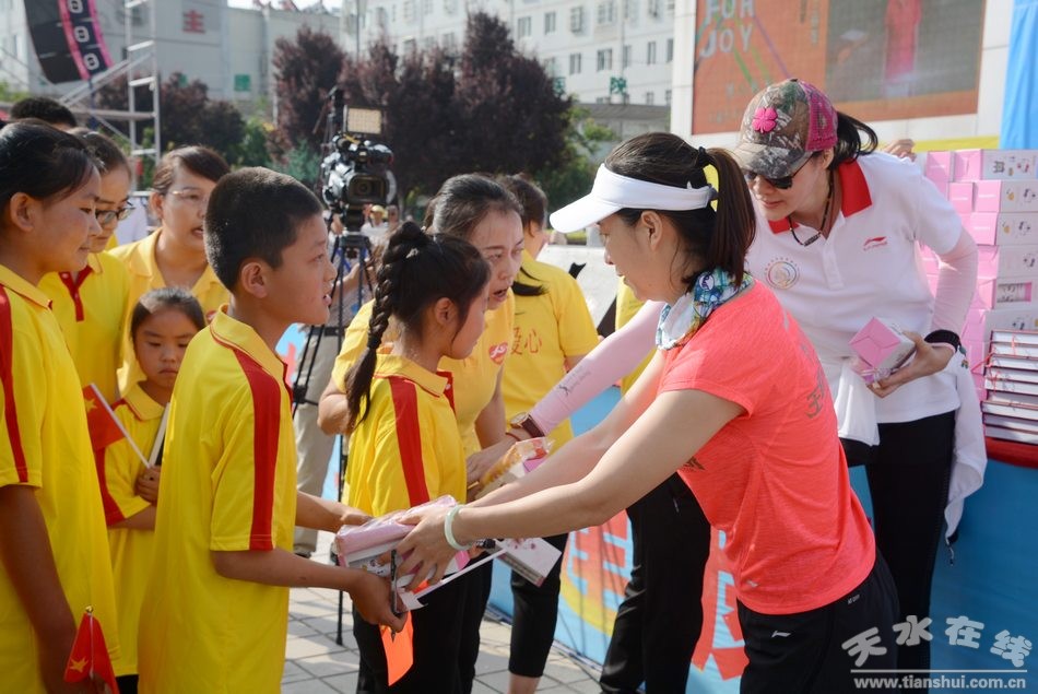 盛夏的清水,激情飛揚。7月1日,應(yīng)邀參加2018年全國徒步大會甘肅清水站暨第二屆“天河春酒•軒轅杯”全民健步走活動的競走奧運冠軍王麗萍、體操奧運冠軍鄒凱和女排奧運冠軍趙蕊蕊為清水縣“一對一獻愛心”貧困兒童資助協(xié)會資助的60名貧困學(xué)生進行了現(xiàn)場簽名贈書公益活動,以實際行動為貧困兒童傳遞不畏艱難、頑強拼搏、自信自強、超越自我的體育精神。