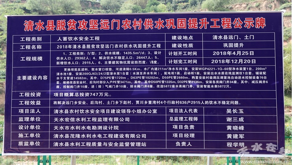 負(fù)責(zé)工程實(shí)施的項(xiàng)目法人、清水縣茂隆水利水電工程建設(shè)有限公司負(fù)責(zé)人黃斌介紹說(shuō),遠(yuǎn)門農(nóng)村安全飲水工程早在2007年建成并投入使用,近年來(lái),由于群眾生活水平逐漸提高,群眾用水量增大,加之部分管網(wǎng)老化損壞,已不能滿足群眾正常安全飲水,這次將重點(diǎn)圍繞水質(zhì)處理凈化、管網(wǎng)改造提升進(jìn)行,工程竣工后會(huì)讓群眾喝上更加安全放心的水。