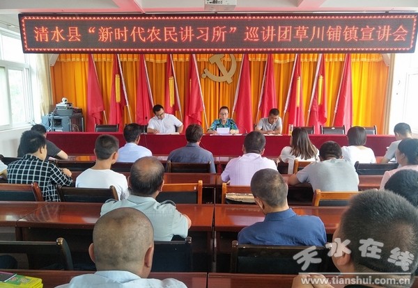 為深入學(xué)習(xí)貫徹黨的十九大精神,全面落實(shí)習(xí)近平總書(shū)記關(guān)于新時(shí)代農(nóng)民講習(xí)所工作重要指示精神,努力提高農(nóng)民思想道德素質(zhì)、民主法制意識(shí),提升干部群眾脫貧攻堅(jiān)內(nèi)生動(dòng)力,密切黨群干群關(guān)系,正確引領(lǐng)社會(huì)新風(fēng)尚,全面提升農(nóng)村鄉(xiāng)風(fēng)文明建設(shè)。8月7日,清水縣“新時(shí)代農(nóng)民講習(xí)所”巡講團(tuán)第一巡講組走進(jìn)草川鋪鎮(zhèn)開(kāi)展宣講活動(dòng)。草川鋪鎮(zhèn)全體鎮(zhèn)干部、11個(gè)行政村黨支部書(shū)記、群眾代表共計(jì)100余人參加了宣講活動(dòng)。