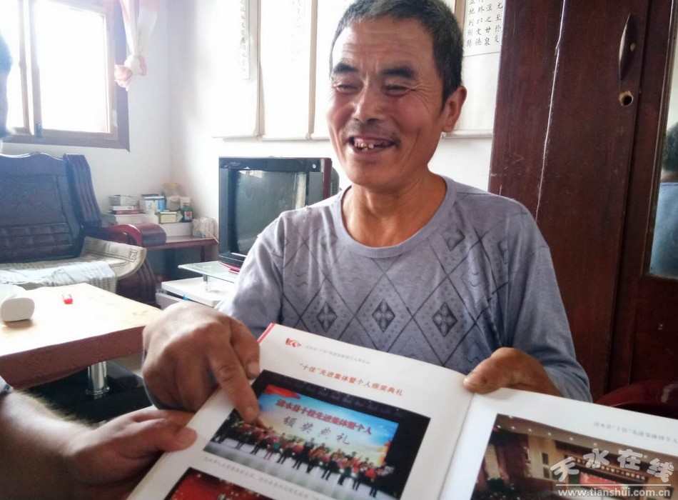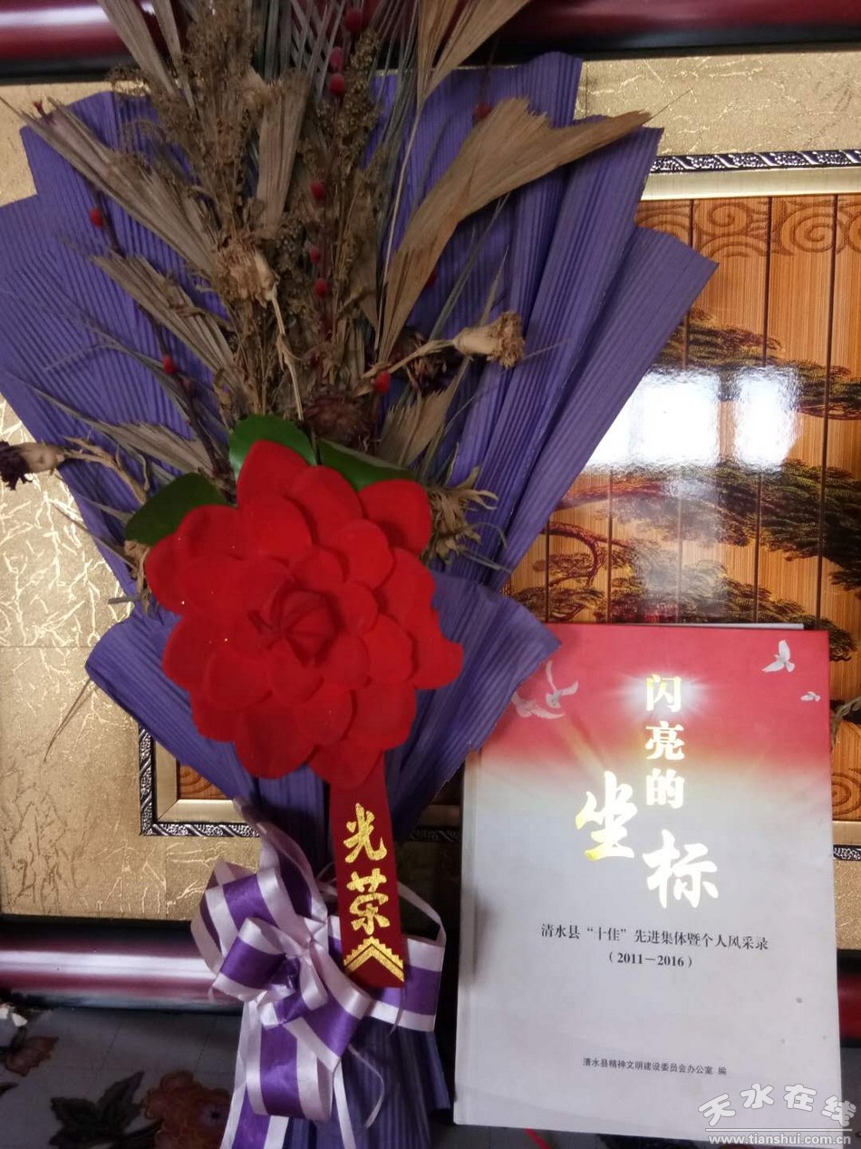 走進村民雷嘗嘗家,院子干凈整潔,屋內(nèi)收拾的井井有條,雷嘗嘗的丈夫趙福堂迫不及待的翻開清水縣十佳先進集體暨個人風采錄【閃亮的坐標】,他一邊翻閱,一邊介紹,我們家的事跡在267頁,他說:“這是我們的榮譽,是我們的精神,這束鮮花雖然干枯了,但是我們認為她永遠是鮮活的,她不但是我們家的榮譽,更是全村的榜樣,這就是精神,人有了精神,生活就有信心,脫貧就更有動力”