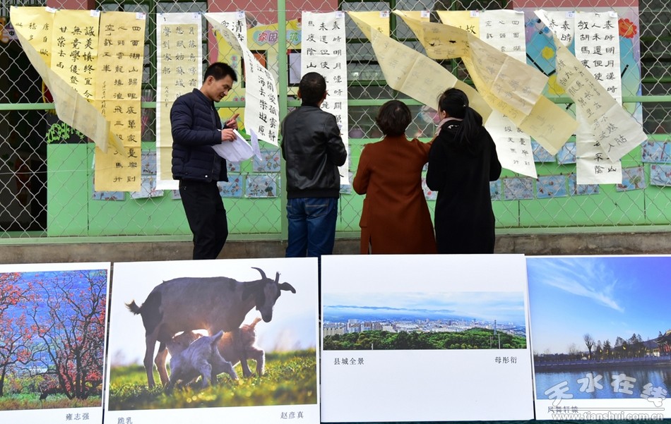活動邀請了全縣書協(xié)部分會員蒞臨指導(dǎo)。全校首次進行現(xiàn)場書法、繪畫創(chuàng)作交流,新穎獨特,令人耳目一新。廣大師生積極參與,熱情高漲,其中參加毛筆書法的有101人,硬筆書法63人,國畫42人,攝影30人,手工制作160多件。