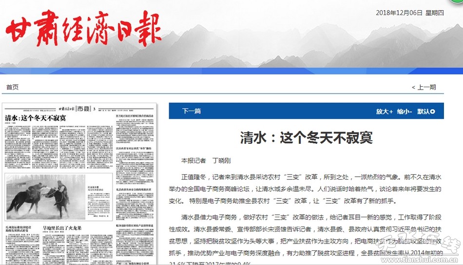 記者看到,清水縣立足特色優(yōu)勢(shì)產(chǎn)業(yè),大力實(shí)施電商扶貧工程,探索實(shí)施“優(yōu)勢(shì)產(chǎn)業(yè)+微媒直銷+全媒體推廣+全民參與”的清水電商扶貧模式,走出了一條電商推動(dòng)農(nóng)業(yè)供給側(cè)結(jié)構(gòu)性改革、助力脫貧攻堅(jiān)、增加農(nóng)民收入的新路子。2018年,清水縣榮獲“全國電子商務(wù)進(jìn)農(nóng)村綜合示范縣”。