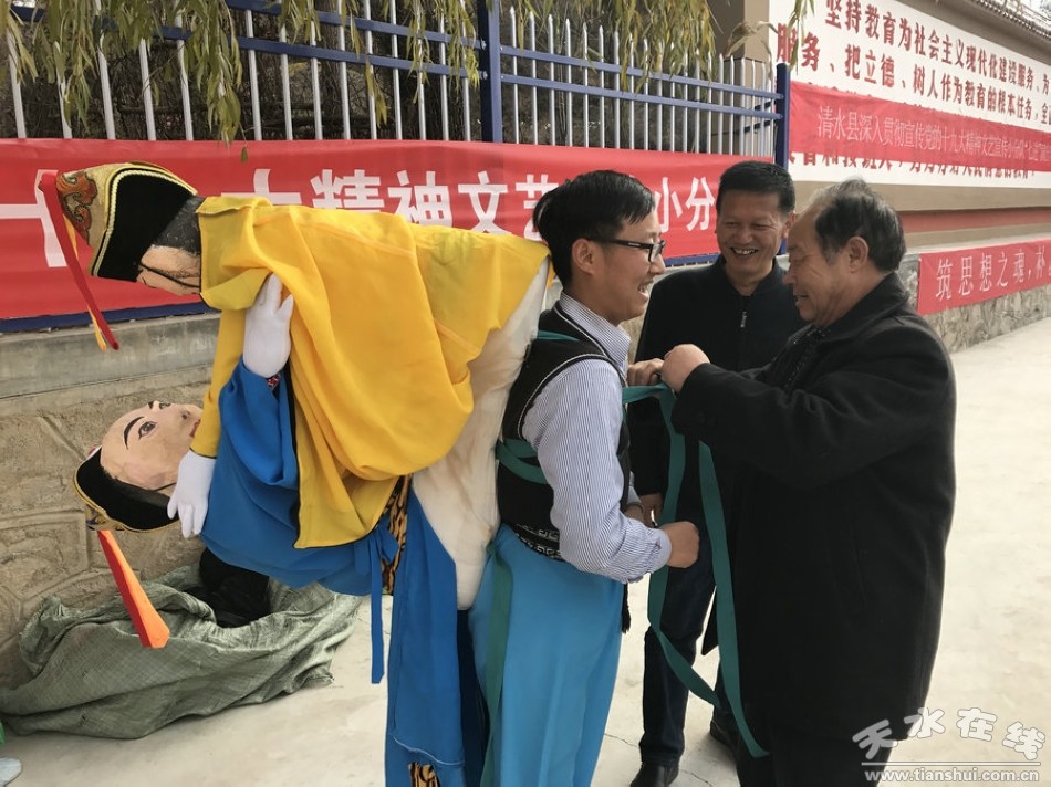 “一人頂兩人,難解又難分。自己摔自己,腳下定乾坤。”緱紅斌說(shuō),“簡(jiǎn)單說(shuō),這就是木人摔跤!本椉t斌又說(shuō)起了自己與木人摔跤的不解情緣。緱紅斌父親緱煥文在當(dāng)?shù)貏F(tuán)工作,他從小在梨園世家的熏陶下酷愛(ài)戲曲,13歲便登臺(tái)演戲,有良好的戲曲功底。學(xué)習(xí)清水木人摔跤,緱紅斌說(shuō),非常偶然,但他記得非常清楚。2008年正在上大學(xué)的他利用假期的空閑時(shí)間隨縣劇團(tuán)下鄉(xiāng)演出,演出期間,唯一會(huì)耍木人摔跤的一位演員突然離職,剛好市電視臺(tái)要為清水木人摔跤做一期節(jié)目。這可難壞了劇團(tuán)領(lǐng)導(dǎo),其他人都不會(huì)表演,另外也沒(méi)人愿意學(xué),只有緱紅斌的父親緱煥文會(huì)耍木人摔跤,但年齡太大,表演困難。于是,他說(shuō)“讓我試一試”。沒(méi)料到的是,經(jīng)過(guò)他父親一早上的教授,下午劇團(tuán)的領(lǐng)導(dǎo)就讓他正式上臺(tái)演出。