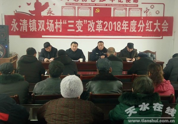 12月20日下午,清水縣永清鎮(zhèn)雙場(chǎng)村召開“三變”改革2018年度分紅大會(huì)。鎮(zhèn)村干部、駐村幫扶工作隊(duì)、合作社社員60余人參加大會(huì)。此次村集體和20戶建檔立卡戶享受共4.3萬(wàn)元入股分紅收益,最高的戶可分到3600元,最低的分到600元,雙場(chǎng)村村集體享受分紅1萬(wàn)元。