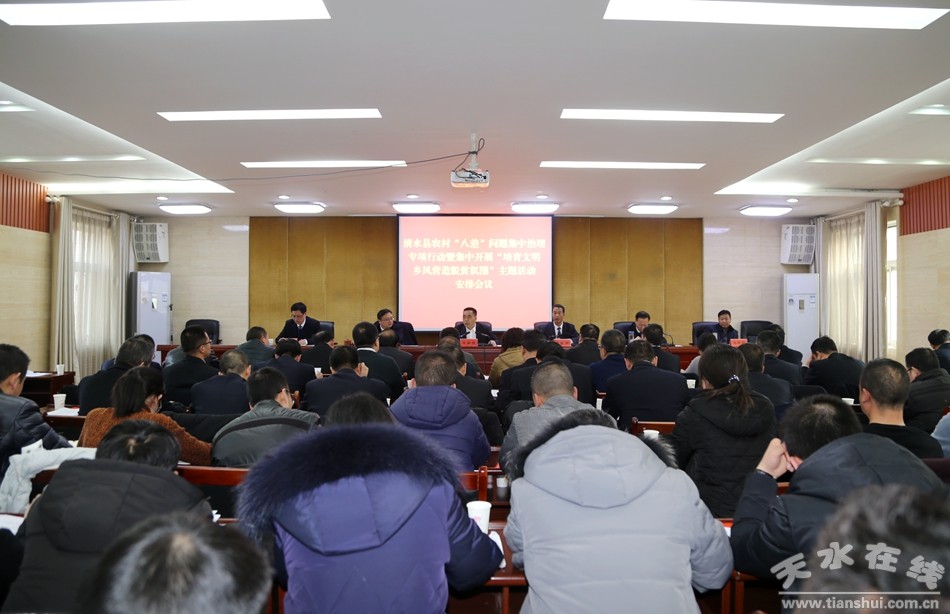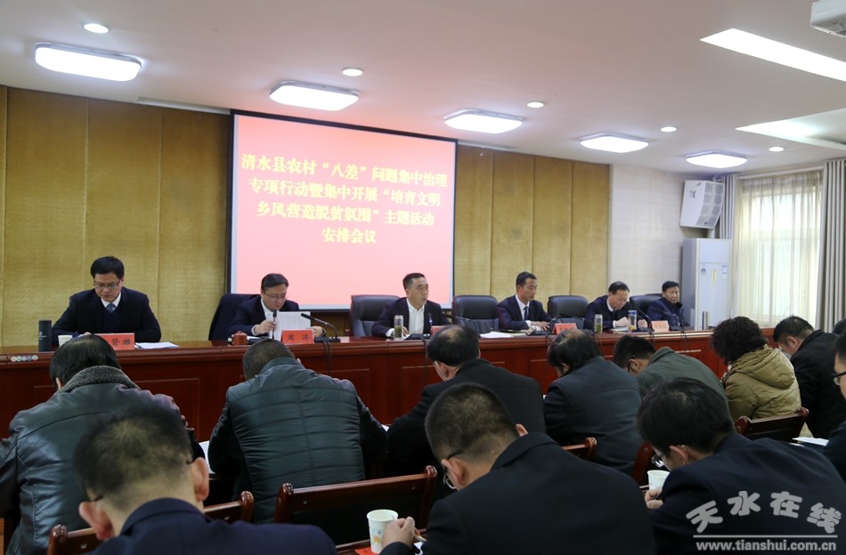1月7日下午,清水縣召開農(nóng)村“八差”問題集中治理專項行動暨集中開展“培育文明鄉(xiāng)風營造脫貧氛圍”主題活動安排會議,貫徹落實全市農(nóng)村“八差”問題集中治理專項行動安排部署會議及全市開展“培育文明鄉(xiāng)風 營造脫貧氛圍”活動安排會議精神,對全縣農(nóng)村“八差”問題集中治理專項行動暨集中開展“培育文明鄉(xiāng)風營造脫貧氛圍”主題活動進行全面安排部署。