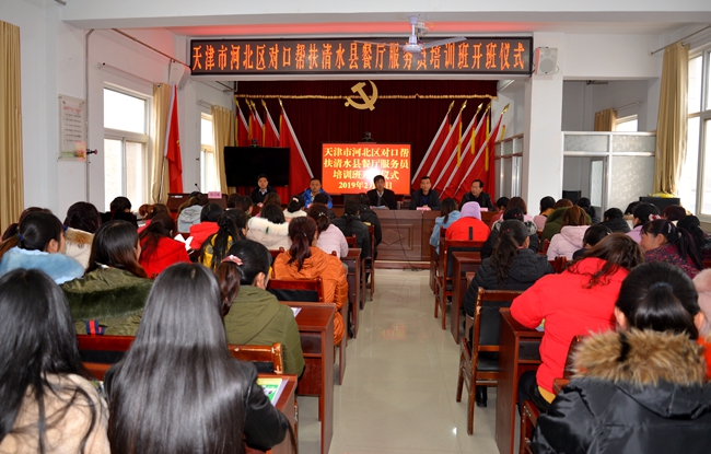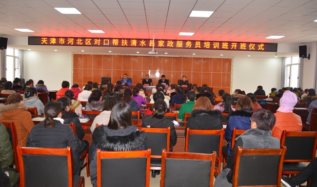 為全面貫徹落實(shí)中央、省市關(guān)于打贏脫貧攻堅(jiān)戰(zhàn)以及東西部扶貧協(xié)作的決策部署和工作要求,全力穩(wěn)定和擴(kuò)大就業(yè),促進(jìn)農(nóng)村勞動力特別是建檔立卡貧困勞動力轉(zhuǎn)移就業(yè)及農(nóng)民工返鄉(xiāng)創(chuàng)業(yè),2月14日,天津市河北區(qū)人社局對口幫扶清水縣家政服務(wù)暨餐廳服務(wù)培訓(xùn)班開班,清水縣政府副縣長馬小平,河北區(qū)就業(yè)訓(xùn)練中心主任劉通,河北區(qū)選派培訓(xùn)教師,縣人社局、永清、白沙兩鎮(zhèn)負(fù)責(zé)人以及培訓(xùn)學(xué)員共200多人參加開班儀式。