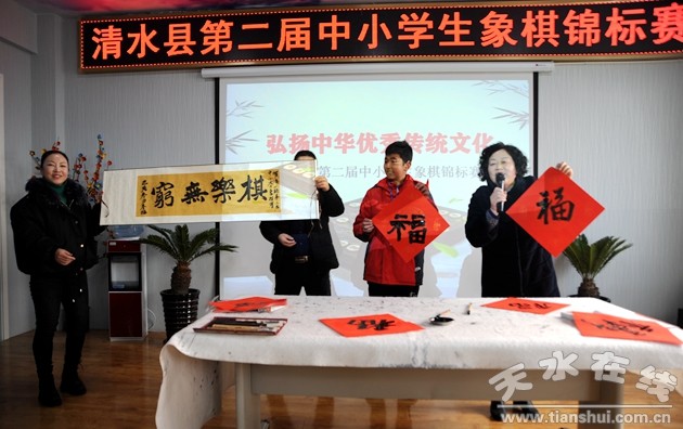 比賽期間,承辦單位清水縣特教學(xué)校邀請(qǐng)當(dāng)?shù)貢覔]毫潑墨,進(jìn)行現(xiàn)場(chǎng)創(chuàng)作,為參賽選手贈(zèng)送書法作品,送上新春祝福;邀請(qǐng)各學(xué)校才藝突出的小演員在現(xiàn)場(chǎng)進(jìn)行鋼琴、葫蘆絲、架子鼓和戲劇等文藝節(jié)目表演,為比賽助興加油,體現(xiàn)了棋琴書畫的完美結(jié)合,營造了濃厚的節(jié)日氛圍,呈現(xiàn)出異彩紛呈,百花齊放的精彩場(chǎng)面。