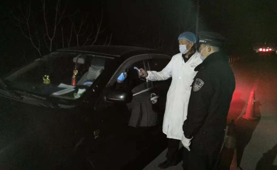 (公安民警與醫(yī)護(hù)人員設(shè)卡夜查出入車(chē)輛,對(duì)駕駛員及乘客測(cè)量體溫)