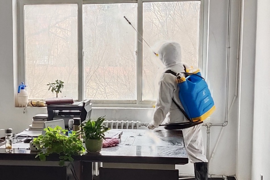 (清水縣疾控中心專業(yè)技術(shù)人員在辦公場所開展消毒)