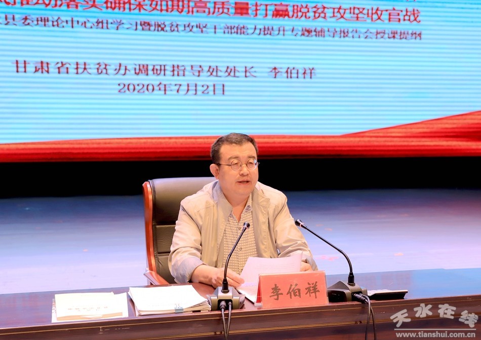7月2日,清水縣委理論中心組學(xué)習(xí)暨脫貧攻堅(jiān)干部能力提升專題輔導(dǎo)報(bào)告會(huì)在軒轅大劇院舉行。省扶貧辦調(diào)研指導(dǎo)處處長(zhǎng)李伯祥以《認(rèn)真學(xué)習(xí)貫徹習(xí)近平總書記關(guān)于扶貧工作重要論述,聚焦目標(biāo)標(biāo)準(zhǔn)貫徹精準(zhǔn)方略只爭(zhēng)朝夕快馬加鞭推進(jìn)工作,以嚴(yán)實(shí)作風(fēng)推動(dòng)落實(shí)確保如期高質(zhì)量打贏脫貧攻堅(jiān)收官戰(zhàn)》為題進(jìn)行輔導(dǎo)授課。