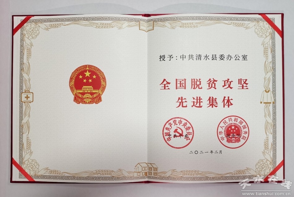 日前,習(xí)近平總書記在全國(guó)脫貧攻堅(jiān)總結(jié)表彰大會(huì)上莊嚴(yán)宣告:“我國(guó)脫貧攻堅(jiān)戰(zhàn)取得了全面勝利,完成了消除絕對(duì)貧困的艱巨任務(wù),創(chuàng)造了又一個(gè)彪炳史冊(cè)的人間奇跡!”在這次大會(huì)上,中共清水縣委辦公室被表彰為“全國(guó)脫貧攻堅(jiān)先進(jìn)集體”。