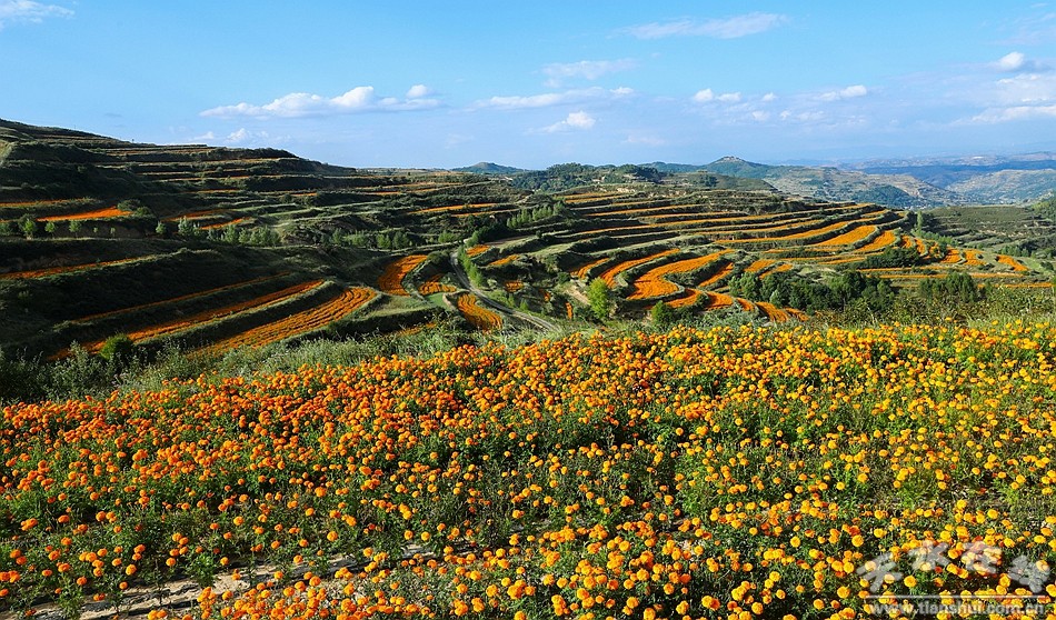 時(shí)下,在松樹(shù)鎮(zhèn)千畝萬(wàn)壽菊種植基地,一片片黃燦燦的萬(wàn)壽菊迎風(fēng)綻放,一彎一彎金黃色花田鑲嵌在綠色的原野上,如同黃金彩帶,在藍(lán)天白云下鋪展,藍(lán)天、花海、青山,繪就了一幅渾然天成的水彩畫。