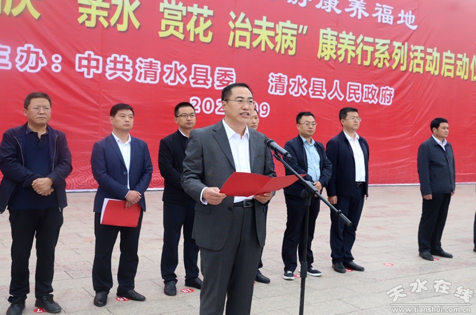 縣委書記馬越垠宣布清水縣2021年迎中秋慶國(guó)慶“親水賞花治未病”康養(yǎng)行系列活動(dòng)啟動(dòng)。市文化和旅游局副局長(zhǎng)郭靖,縣委副書記、縣長(zhǎng)李菊霞,縣人大常委會(huì)主任周偉東,縣政協(xié)主席丁旺喜及其他在家縣級(jí)領(lǐng)導(dǎo)出席啟動(dòng)儀式?h委常委、宣傳部部長(zhǎng)宋賢雄介紹了清水縣迎中秋慶國(guó)慶“親水賞花治未病”康養(yǎng)行系列活動(dòng)情況,副縣長(zhǎng)裴亮亮主持啟動(dòng)儀式。