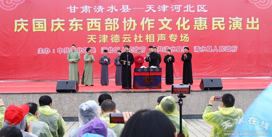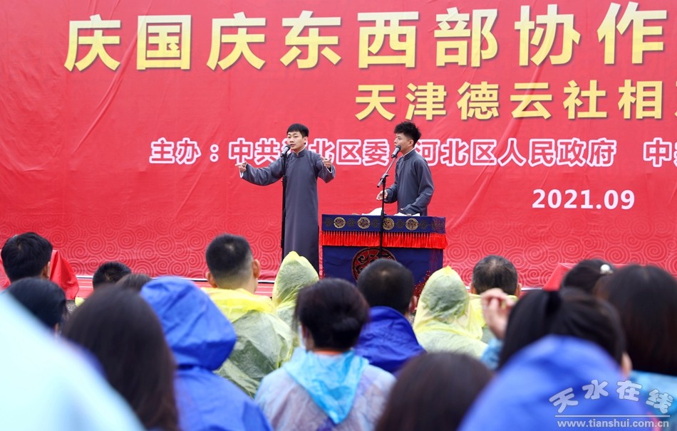 東西協(xié)作結(jié)碩果,攜手奮斗織錦繡。9月26日下午,甘肅清水縣—天津河北區(qū)慶國慶東西部協(xié)作文藝惠民演出天津德云社相聲專場義演活動在清水縣軒轅廣場濃情上演,這是兩地深入貫徹落實(shí)習(xí)近平總書記對深化東西部協(xié)作和定點(diǎn)幫扶工作重要指示精神的具體行動,是清水歷史上首次大型專業(yè)相聲社團(tuán)的專場演出,也是一場奏響時代旋律、抒發(fā)家國情懷、禮贊百年輝煌的藝術(shù)盛宴和文化大餐。