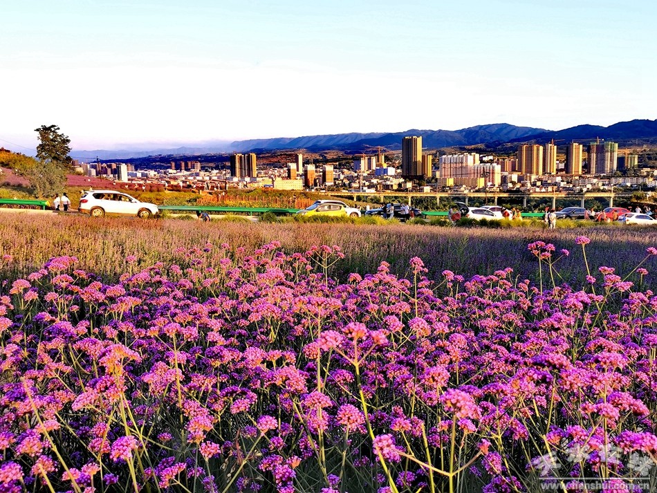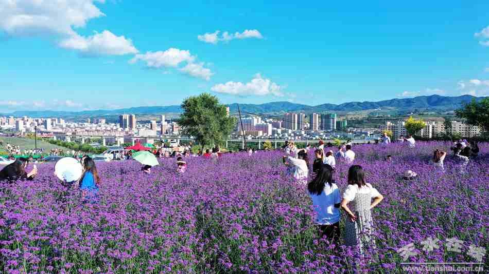 剛爬上清水縣花舞北山園,浪漫氣息就撲面而來。大片的紫色馬鞭草在微風(fēng)中搖曳,千萬株花蕾同時綻放,層層疊疊、起起落落、飄飄裊裊,像不小心打翻的顏料盤,在山坡上渲染開來。近處的游客、花海與遠處的街道、樓房,構(gòu)成了一幅“醉”美畫卷。