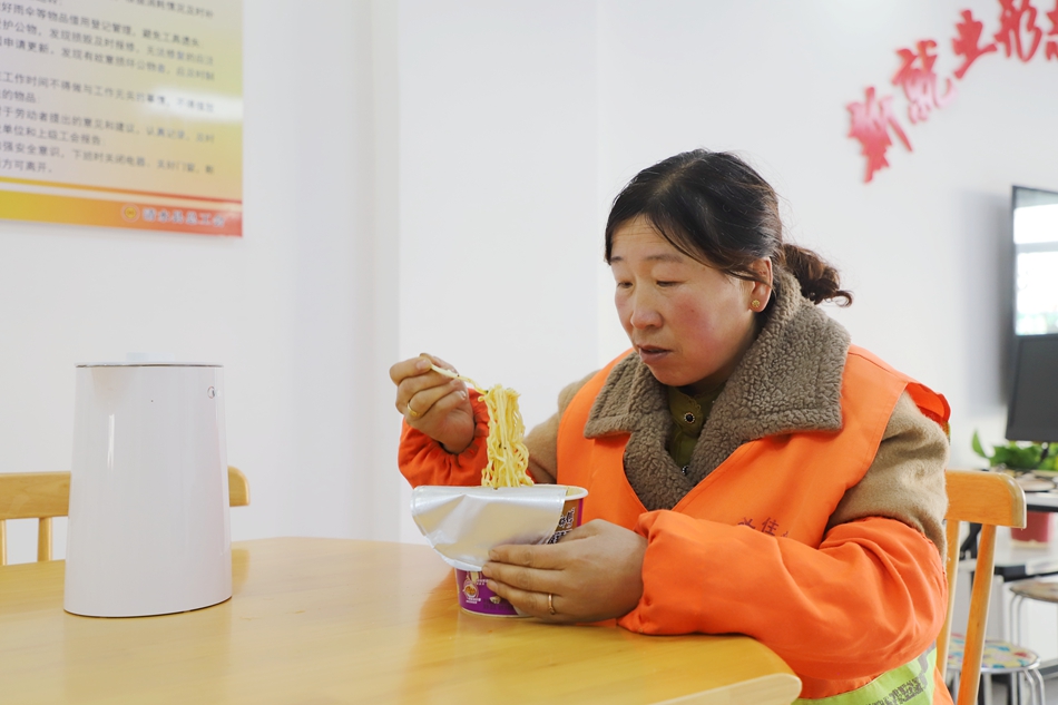 環(huán)衛(wèi)工人王彩霞是驛站的“?汀保诤腕A站工作人員拉家常。正值中午,王阿姨走向冰箱,拿出了里面的方便面沖泡起來。王阿姨高興地告訴記者,“我負(fù)責(zé)文昌路的衛(wèi)生保潔,經(jīng)常過來,渴了喝口熱水,餓了吃包泡面,累了進(jìn)來休息一會兒,真的太方便了!