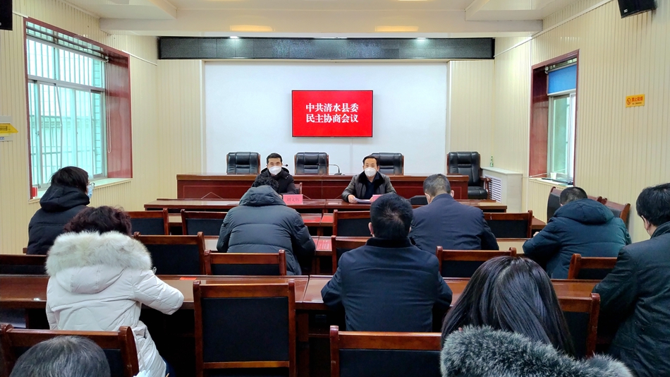 12月16日,中共清水縣委專題民主協(xié)商會議召開,邀請縣民盟支部、工商聯(lián)負(fù)責(zé)人和無黨派人士代表、部分人民團(tuán)體負(fù)責(zé)人,就縣人大、縣政協(xié)領(lǐng)導(dǎo)班子人事安排事宜進(jìn)行民主協(xié)商,聽取意見建議。