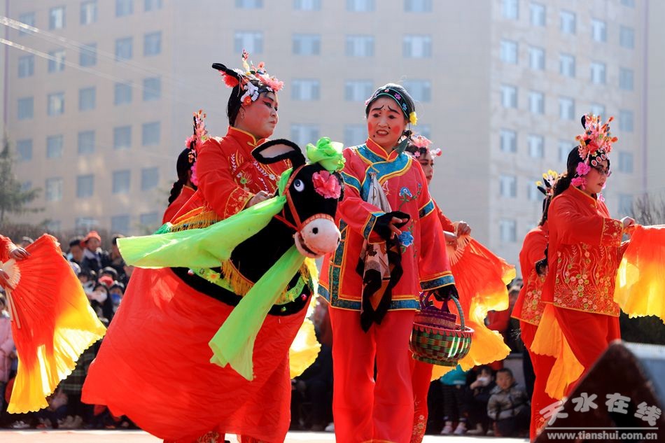展演現(xiàn)場(chǎng),各鄉(xiāng)鎮(zhèn)結(jié)合本土特色民俗推選的非遺節(jié)目悉數(shù)登場(chǎng)。別具特色的民間小調(diào)巧妙結(jié)合清水跑驢、清水秧歌、清水跑旱船等民間元素,趣味十足又熱鬧非凡。雄獅勁舞祈求和平安康,傳統(tǒng)武術(shù)、踩高蹺等節(jié)目展現(xiàn)出清水人民新的一年里良好的精神風(fēng)貌和步步高升的美好祝福。皮影戲、眉戶戲等節(jié)目通過通俗易懂、旋律優(yōu)美的唱詞,反映群眾日常勞作、婚姻嫁娶等風(fēng)俗民情。表演追求大眾化、平民化,老少皆宜,雅俗共賞,內(nèi)涵豐富而意趣簡(jiǎn)潔,贏得現(xiàn)場(chǎng)觀眾陣陣喝彩。
