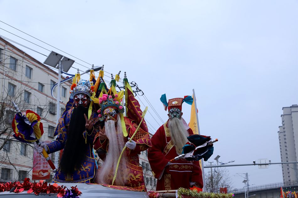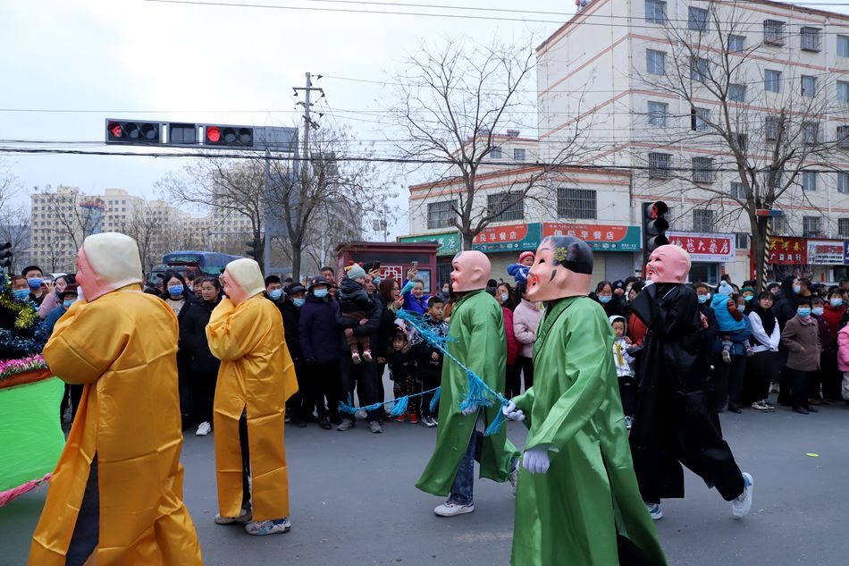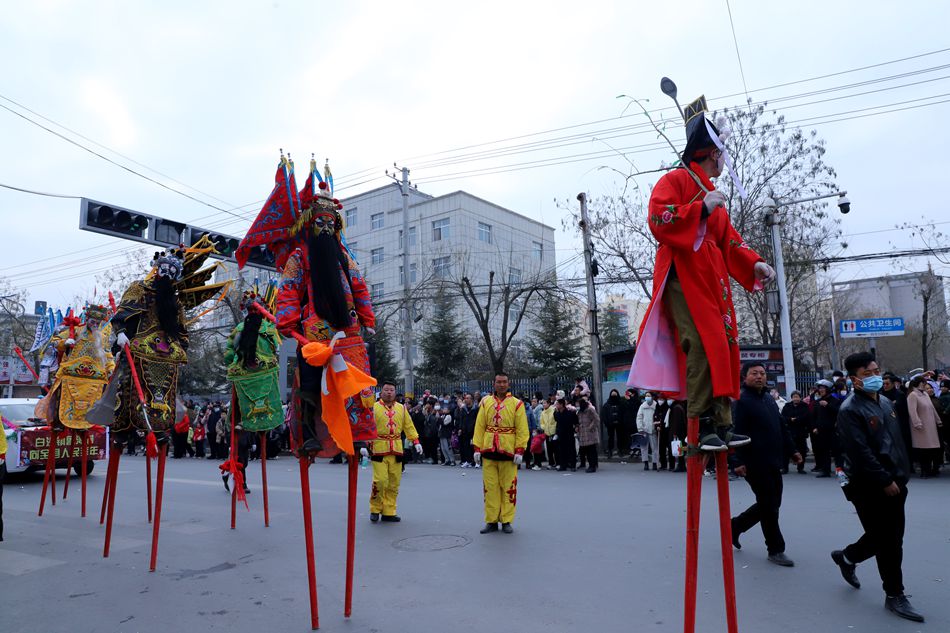 在永清路、中山路等路段,在鏗鏘有力的鑼鼓聲中,身著盛裝的演員們個(gè)個(gè)精神抖擻。伴隨著歡快的鑼鼓聲,舞龍、舞獅、高蹺、秧歌以及一輛輛別具匠心的彩車等精彩紛呈的社火輪番上演。