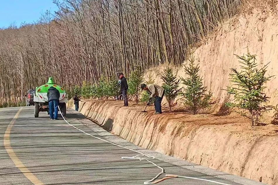 在秦亭鎮(zhèn)閣河口至杈杈鋪463縣道,專門調配鏟車、挖機、打眼機等機械,統(tǒng)一對柏油路兩側進行機械刨平、放線、打點、打眼、栽植、填土,截至當前,已調配丁香1600棵,云杉2112棵、白楊800棵。苗木栽植到位后,將及時進行定根澆水、覆土保墑,確保苗木成活率。
