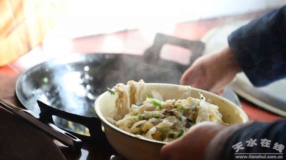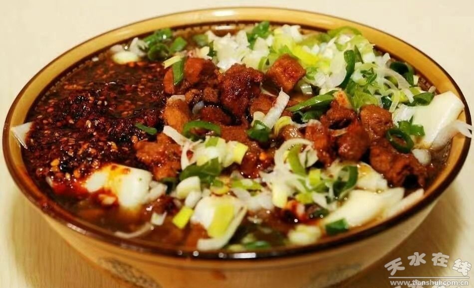 清水八大碗是清水的傳統(tǒng)美食,八大碗往往用于宴客之際,上八道大菜,都用清一色的大碗,看起來爽快、吃起來過癮,故稱其為八大碗。八大碗一般為四葷四素,包括燴豆腐、燉粉條、白菜、胡蘿卜、炸酥肉、炸丸子、紅燒肉、燒排骨、燴牛肉,以素菜雜燴汆菜入底,葷菜澆頭入八碗之中。八大碗寓意吉祥如意、團(tuán)圓美好,在清水,八大碗成了一種傳統(tǒng),被越來越多的家庭傳承著。