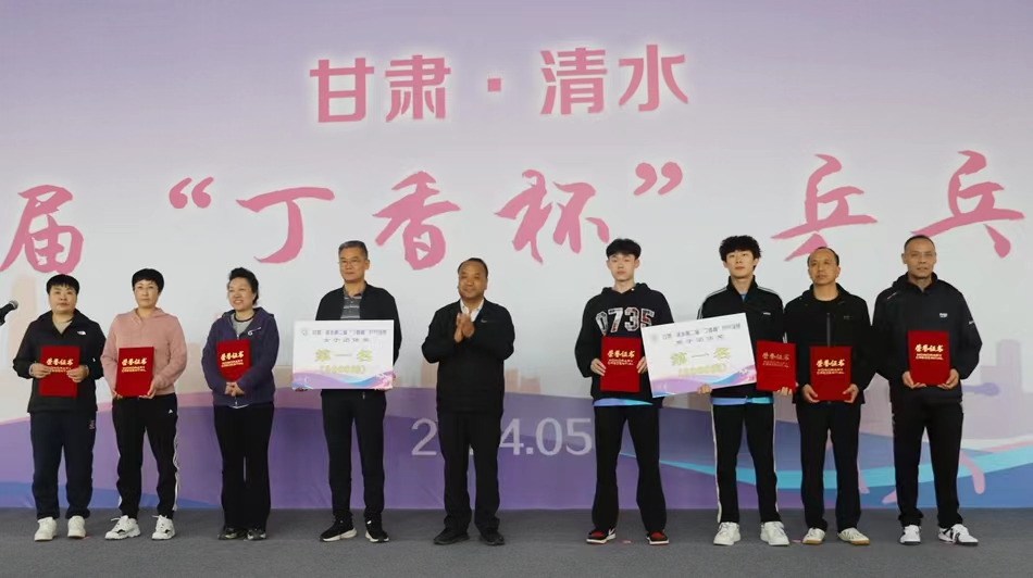 清水縣委常委、宣傳部部長馬小平,縣人大常委會副主任劉林平,縣政協(xié)副主席李國楨分別為甘肅·清水第二屆“丁香杯”乒乓球賽男子組、女子組前三名代表隊頒獎。