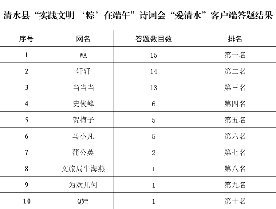 為豐富節(jié)日文化活動(dòng),滿足群眾的精神文化需求,讓廣大干部群眾度過一個(gè)溫馨、和順的端午節(jié)。由中共清水縣委宣傳部主辦,清水縣新時(shí)代文明實(shí)踐中心辦公室、清水縣融媒體中心承辦,特別推出清水縣2024年“實(shí)踐文明‘粽’在端午”網(wǎng)絡(luò)詩詞會(huì)。