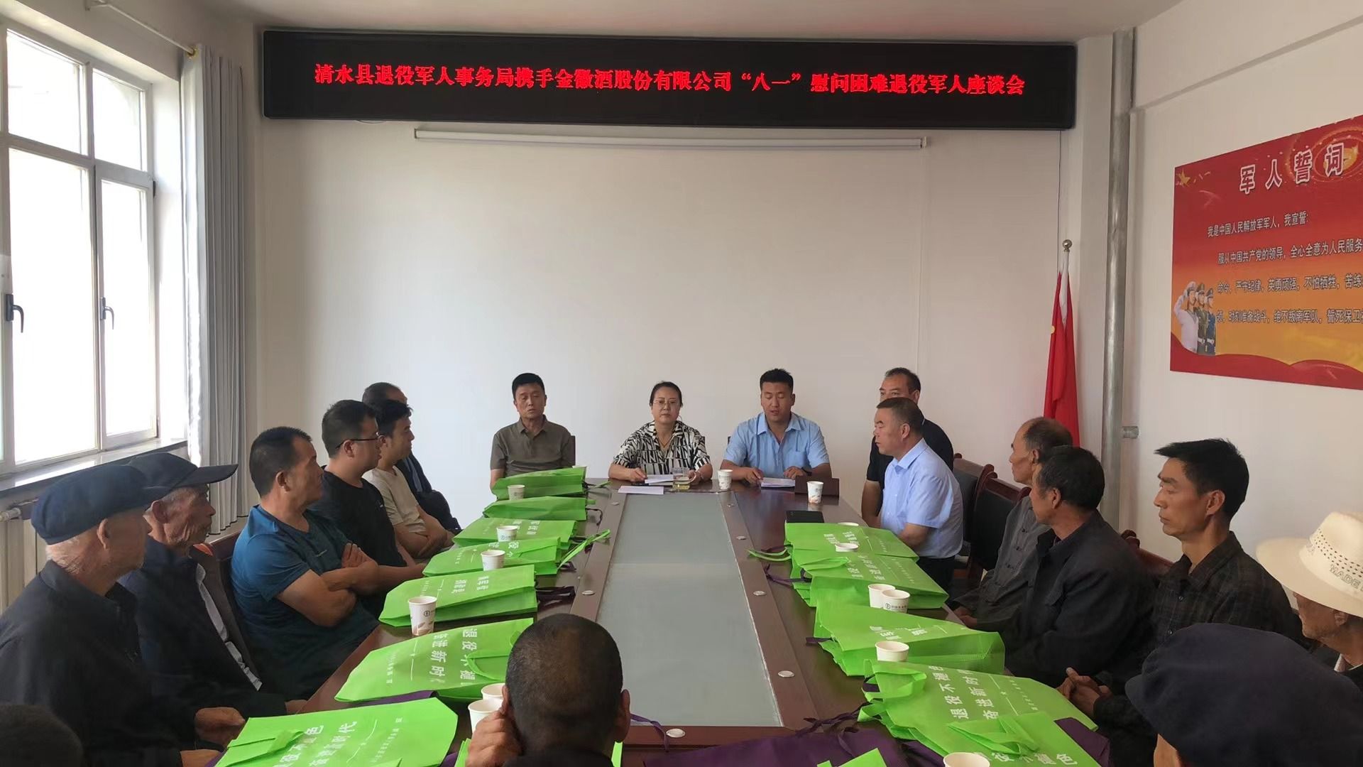 在第97個建軍節(jié)來臨之際,為大力弘揚(yáng)擁軍優(yōu)屬光榮傳統(tǒng),進(jìn)一步提升退役軍人的榮譽(yù)感和獲得感。7月31日早上,清水縣退役軍人事務(wù)局?jǐn)y手金徽酒股份有限公司舉行了“八一”慰問困難退役軍人座談會,對20名困難退役軍人代表進(jìn)行了慰問,為他們送去了米、油、牛奶等慰問品和節(jié)日的祝福。