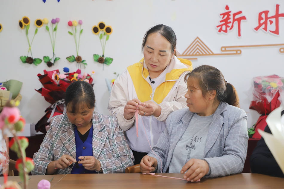 正在現(xiàn)場(chǎng)教學(xué)的張小艷是合作社負(fù)責(zé)人,也是清水縣土門鎮(zhèn)“巧手編織”的發(fā)起者和倡導(dǎo)者。和其他農(nóng)村婦女一樣,張小艷也日復(fù)一日過(guò)著“老公孩子熱炕頭”的生活。2022年,冬奧會(huì)頒獎(jiǎng)花束“絨耀之花”的“出圈”,讓她看到了手工編織的市場(chǎng)前景。張小艷嘗試自己看著圖樣和網(wǎng)絡(luò)教學(xué)視頻編織,發(fā)現(xiàn)自己也能編織出美麗的花束后,便叫上村里心靈手巧的婦女一起編織,一束束色澤鮮艷、做工精細(xì)的手工絨線編結(jié)花束深受消費(fèi)者喜愛(ài)。在清水縣委和天水市婦聯(lián)的支持下,2023年,創(chuàng)意巧手工藝品農(nóng)民專業(yè)合作社正式成立,并與天水“媧鄉(xiāng)巧娘”文化發(fā)展公司合作,簽訂500支“絨耀之花”的收購(gòu)訂單,為清水縣婦女開(kāi)啟了“手工編織”的創(chuàng)業(yè)之路。