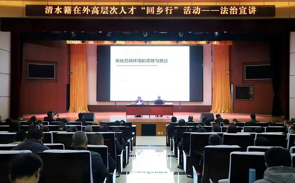 普法宣講報告會上,靳文輝教授以“優(yōu)化營商環(huán)境的原理與路徑”為主題,圍繞營商環(huán)境概述、優(yōu)化營商環(huán)境的目標、優(yōu)化營商環(huán)境的具體標準三個方面作了深入淺出、聲情并茂的精彩講授。講座主題鮮明、重點突出、新穎生動;既有詳實的數(shù)據(jù)對比,又有經(jīng)典的案例分析,既有政策的高度、又有理論的深度、更有實踐的廣度,對深入推進法治清水建設,營造公正透明的法治化營商環(huán)境具有重要的指導意義。同時,他分享了自身成長歷程,表達了對家鄉(xiāng)經(jīng)濟社會發(fā)展的關(guān)心關(guān)注,表示將持續(xù)關(guān)注家鄉(xiāng)法治建設,號召更多在外高層次人才關(guān)心支持家鄉(xiāng)發(fā)展,把先進的人才、技術(shù)、理念引入家鄉(xiāng),為社會主義現(xiàn)代化幸福美好新清水建設貢獻力量。