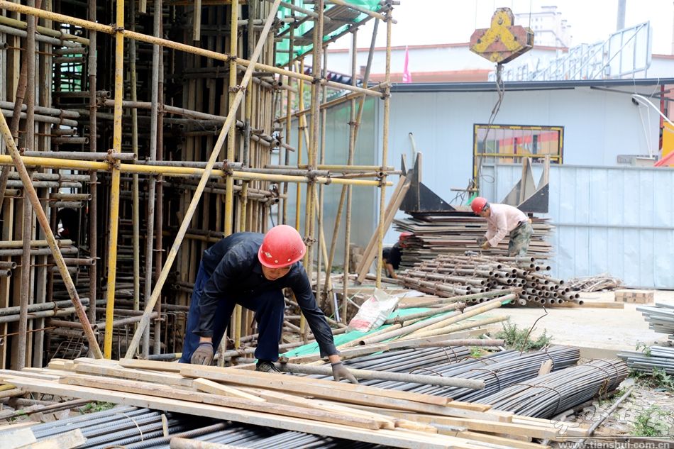 西關(guān)農(nóng)貿(mào)市場項目的建設(shè)現(xiàn)場,塔吊林立、焊花飛濺,工人們在各自崗位上忙碌而有序地作業(yè)。有的在腳手架上專注清理樓面,有的仔細(xì)鋪設(shè)防水保護(hù)層聚苯板,還有的合力搬運模板,裝載機(jī)來回穿梭回填土方,一片繁忙有序的建設(shè)場景。