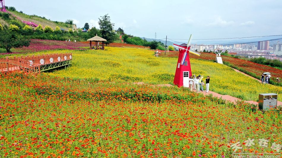 北山生態(tài)景區(qū)內(nèi),大片鮮花肆意綻放,粉白、嫩黃、淡紫的花瓣在陽(yáng)光下熠熠生輝,花海中蜿蜒的木質(zhì)棧道串聯(lián)起各式打卡裝置,游人紛紛駐足留影。不遠(yuǎn)處的涼亭里,有人搖著蒲扇乘涼閑話(huà),也有戲友亮開(kāi)嗓子唱幾段秦腔,梆子聲、喝彩聲混著花香漫開(kāi)。“今天我和朋友一起來(lái)北山游玩,因?yàn)檫@可以拍照打卡,花特別好看,風(fēng)景很美!庇慰透吣扰e著手機(jī)與花海合影,臉上洋溢著開(kāi)心的笑容,“旁邊有一些游樂(lè)設(shè)施可以去玩,和朋友們玩得很開(kāi)心!