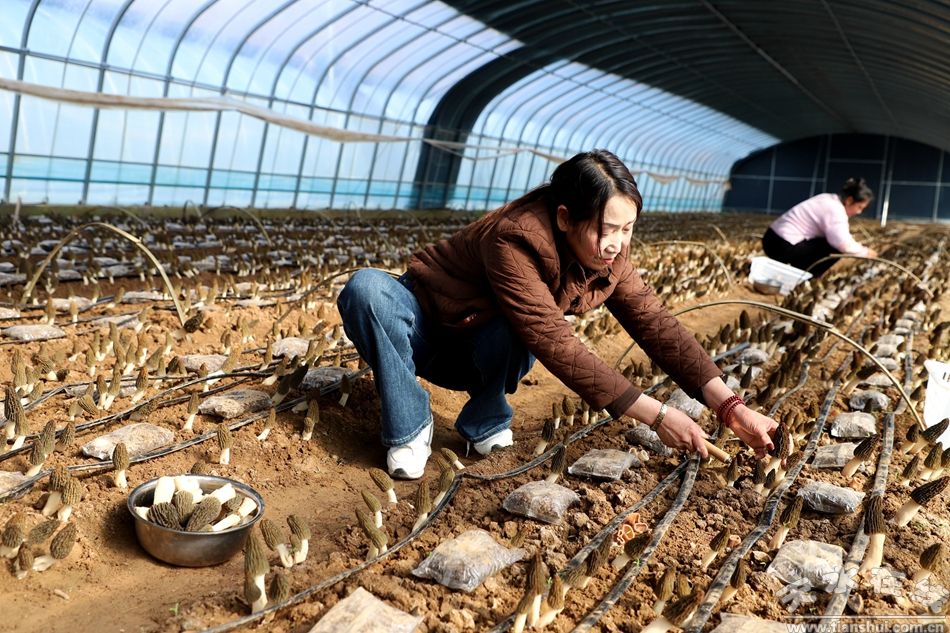 大棚內(nèi),村民們手持小刀,穿梭在菌壟之間熟練地采摘,小心翼翼地將成熟的羊肚菌放入筐中,臉上洋溢著豐收的喜悅。采摘、分揀、裝筐,各項工序有條不紊,忙碌的身影與鮮嫩的菌菇相映成趣,奏響了春日豐收的樂章。