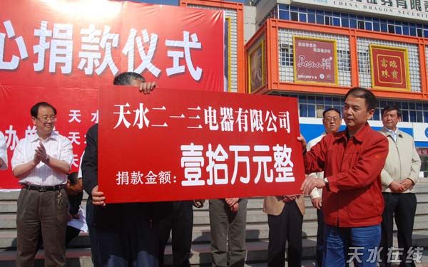 天水二一三總經(jīng)理倪筱仁主持召開了抗震救災捐款動員會,向大會發(fā)出了抗震救災捐款的倡議。他要求職工同志們立即行動起來,以捐款的方式為災區(qū)人民提供援助,幫助災區(qū)人民挽救生命,重建家園,共渡難關。5月16日上午9時,在天水市龍城廣場舉行的全市工商企業(yè)界抗震救災現(xiàn)場捐款儀式上,總經(jīng)理倪筱仁代表企業(yè)現(xiàn)場捐款10萬元,表達了公司對災區(qū)的一片愛心。