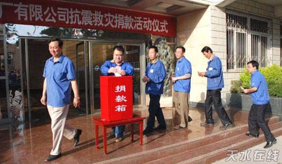 天水長城開關(guān)廠公司繼5月16日捐款10萬元后,公司黨委又組織全公司員工開展了愛心捐款活動。愛心活動中,公司領(lǐng)導(dǎo)、黨員干部積極帶頭捐款,公司領(lǐng)導(dǎo)捐款額達1500元以上、兩位主要領(lǐng)導(dǎo)捐款2000元,黨員捐款額達100元以上,中層管理干部捐款額達200元以上,員工捐款額達50元以上,在短短的一天時間內(nèi),公司全體員工共捐款156195元并于5月19日捐贈進入了全國捐贈專用帳號。目前,公司為地震災(zāi)區(qū)共捐款256195元。