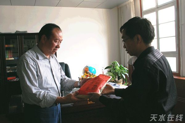 5月26日下午,蘭天集團副總劉曉武受蘭天集團董事長張建友的委托,把蘭天集團全體員工和蘭天城市廣場部分供應商所捐的50000元人民幣交到了秦州教育局局長羅永安的手中。