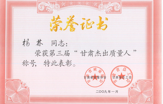 在二零零九年三月十三日于蘭州召開的甘肅省質(zhì)量協(xié)會六屆一次會員代表大會暨質(zhì)量工作表彰大會上,蘭州長城電工股份有限公司董事長,原天水二一三電器有限公司董事長楊林同志被甘肅省質(zhì)量協(xié)會和甘肅省總工會授予 “甘肅省杰出質(zhì)量人”光榮稱號,并頒發(fā)了榮譽證書和獎杯。