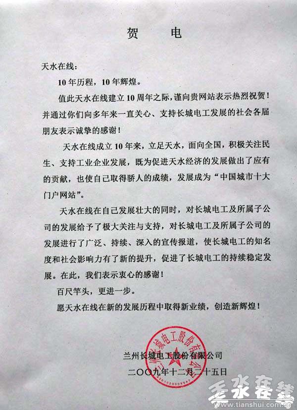 蘭州長城電工致天水在線成立十周年賀電(圖)
