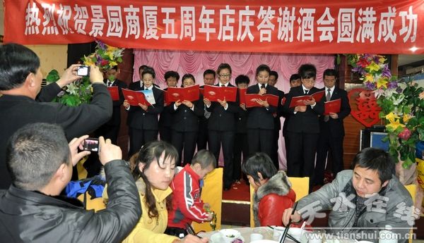 12月31日晚,天水景園商廈隆重舉行五周年店慶答謝酒會(huì),景園集團(tuán)董事長(zhǎng)王玉茂、常務(wù)副總龐錦峰及有關(guān)供應(yīng)商和部分客戶出席酒會(huì)。