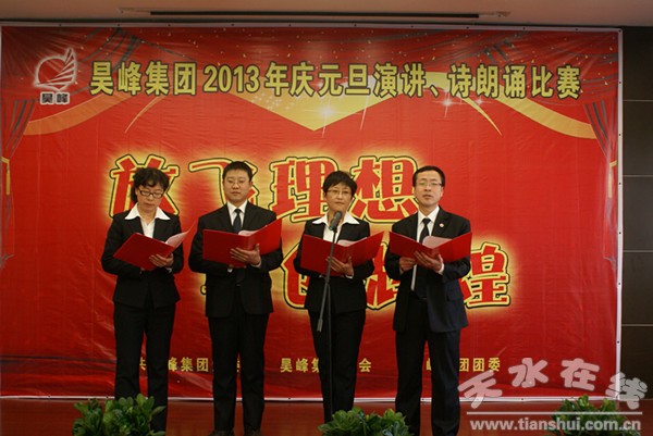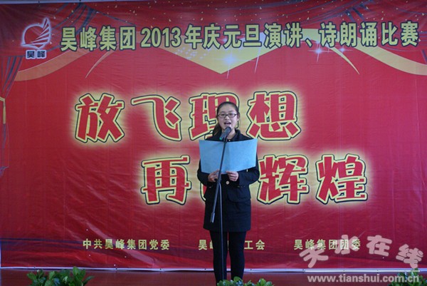 為深入開展“創(chuàng)建學習型企業(yè),爭做學習型員工”活動,不斷提高公司員工臨場應變能力、鍛煉口才和提高自身綜合素質(zhì),達到鍛煉自我、展示風采、彼此交流的目的,甘肅天水昊峰集團控股有限公司黨委、工會、團委在元旦來臨之際,舉辦了“放飛理想、再創(chuàng)輝煌”2013年慶元旦演講、詩朗誦比賽