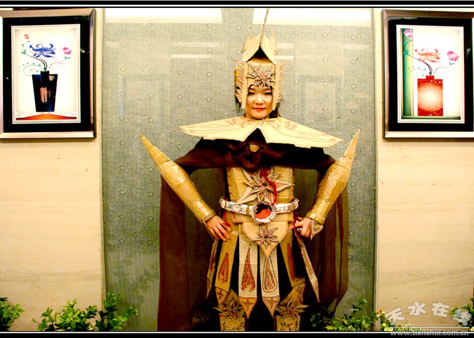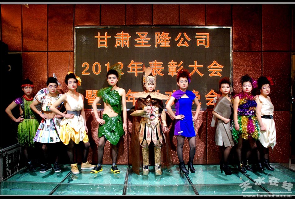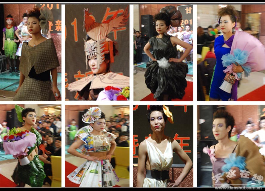 (公司員工用蔬菜、餐巾、包裝箱等用品制作成的時裝走秀)