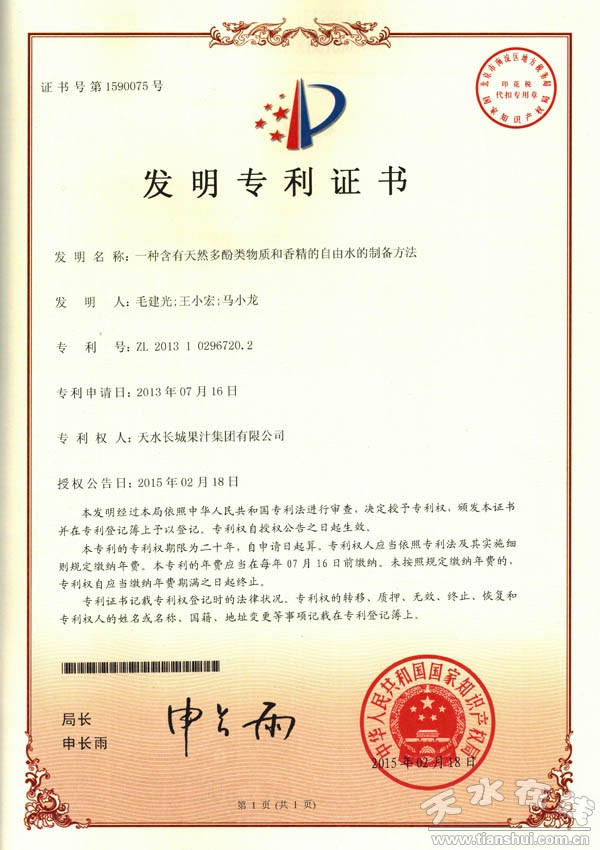 日前,天水長(zhǎng)城果汁集團(tuán)有限公司“一種含有天然多酚類物質(zhì)和香精的自由水的制備方法”獲得國(guó)家知識(shí)產(chǎn)權(quán)局發(fā)明專利,此項(xiàng)發(fā)明專利填補(bǔ)了該公司自主發(fā)明專利的空白。
