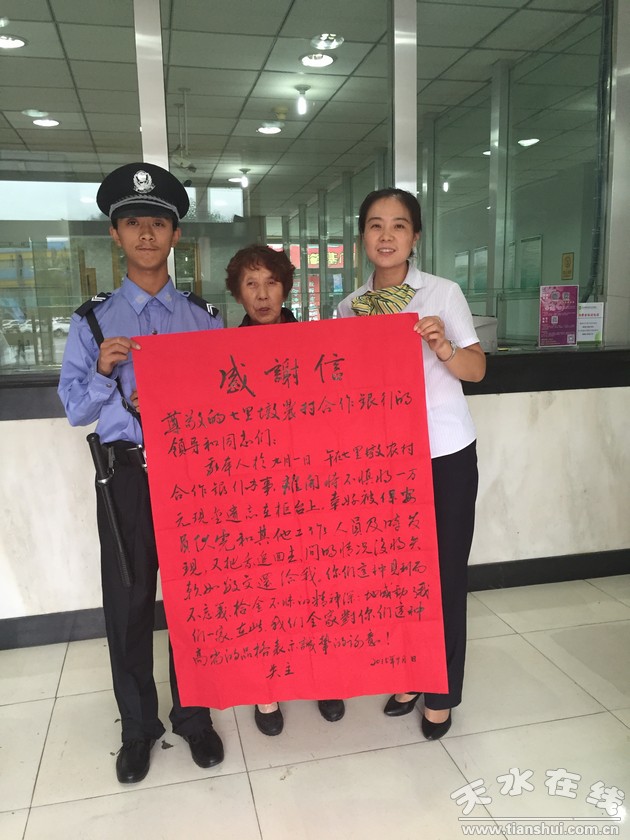 9月1日中午,七里墩分理處當(dāng)班保安伏天龍?jiān)诶醒惨曔^(guò)程中,發(fā)現(xiàn)一號(hào)窗口柜臺(tái)上有一疊鈔票,他立即告知當(dāng)班柜員雷瑾和分理處主任楊云霞,經(jīng)清點(diǎn)現(xiàn)金為一萬(wàn)元整。當(dāng)班柜員雷瑾回憶,最后一位辦理現(xiàn)金取款業(yè)務(wù)的是一位老奶奶,伏天龍也回憶到老人是在沙發(fā)上休息了一會(huì)兒才離開(kāi)的。在楊云霞的安排下,伏天龍趕緊外出追趕,將老人攙扶進(jìn)營(yíng)業(yè)廳。經(jīng)調(diào)閱監(jiān)控核實(shí),窗口遺失的一萬(wàn)元確屬老人在業(yè)務(wù)辦理完畢后落下的。工作人員清點(diǎn)完現(xiàn)金后,當(dāng)場(chǎng)將一萬(wàn)元嶄新的鈔票送到老人手中。當(dāng)老人用顫巍巍的雙手接過(guò)鈔票后,被伏天龍和現(xiàn)場(chǎng)工作人員拾金不昧的精神深深感動(dòng),當(dāng)場(chǎng)抽出1000元現(xiàn)金表示感謝,但被工作人員婉言謝絕;氐郊液,老人心情難以平靜,專(zhuān)門(mén)請(qǐng)人寫(xiě)了一封熱情洋溢的感謝信,并同家人一道把感謝信送到了七里墩分理處。